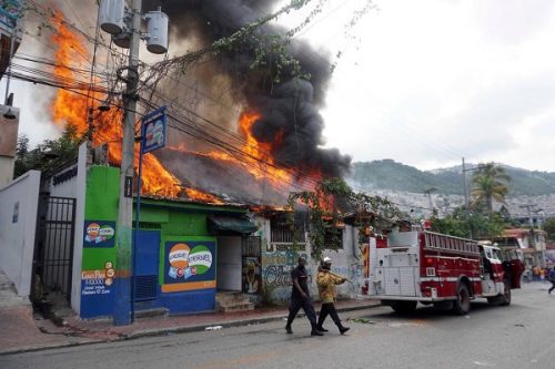 Un immeuble incendié par des manifestants à Port-au-Prince,